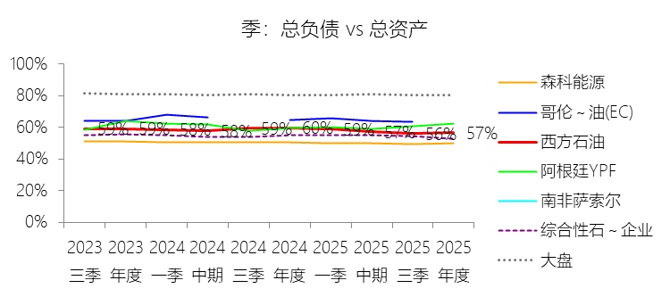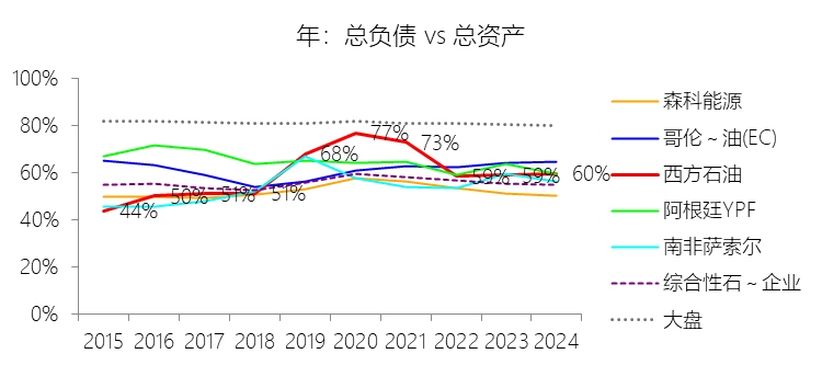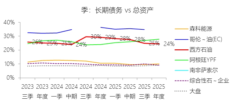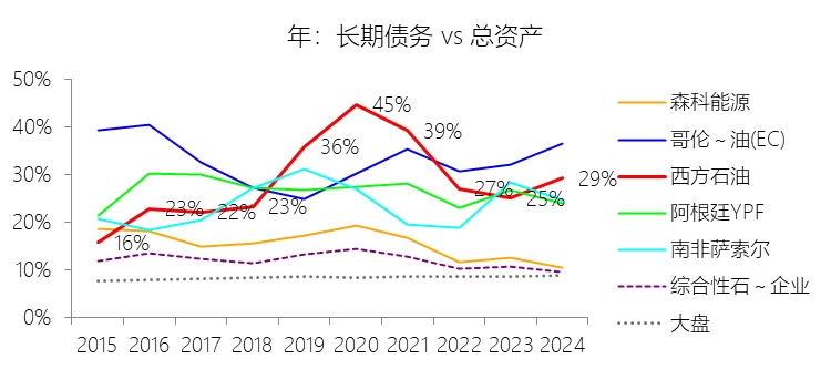 长期债务:2025年末,西方石油的长期债务为206.23亿美元,对比年初减少17.44%,与总资产的比例为24.50%,同比下降4.74个百分点;2015-2024年(十年),此项合计为2031.01亿美元,平均比例为30.46%,比综合性石油与天然气企业行业的均值高18.49个百分点,长期呈上升趋势。