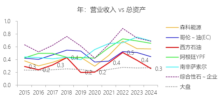 总资产增长率:2025年末,西方石油的总资产为841.86亿美元,对比年初减少1.47%,增速同比(去年同期)下降16.93个百分点;2015-2024年(九年)增长96.84%,年复合增长7.81%,比综合性石油与天然气企业行业的复合增速高6.24个百分点,长期呈下降趋势。增速短期上升主要由于公司在2024年完成了对CrownRock的重大并购,该项价值约124亿美元的交易为资产负债表带来了约118亿美元的油气资产增量,实现了资产规模的短期爆发式增长,2025增速在高基数下回落;增速长期下降主要由于公司自2019年起为降低财务杠杆持续执行大规模非核心资产剥离策略,相继退出加纳、哥伦比亚、南德克萨斯等地区,并在2025年启动了对OxyChem这一重大资产的处置,加之在2015年及2020年低油价周期分别计提了超过100亿美元的巨额资产减值准备,持续冲减了总资产的账面价值;增速高于综合性石油与天然气企业行业的复合增速主要由于2019年对阿纳达科的世纪收购带来了资产规模从439亿美元到1072亿美元的倍增式跳跃,以及2024年再次通过并购CrownRock确立了在二叠纪盆地等高价值领域的领先地位,这种外延式并购驱动的扩张模式在十年统计区间内形成了远超同行业平均内生性增长速度的资本扩张效应。