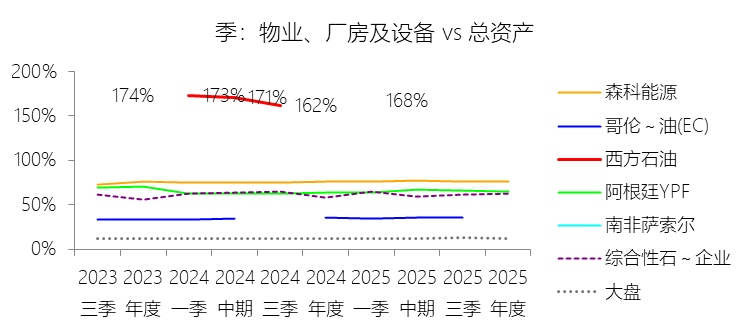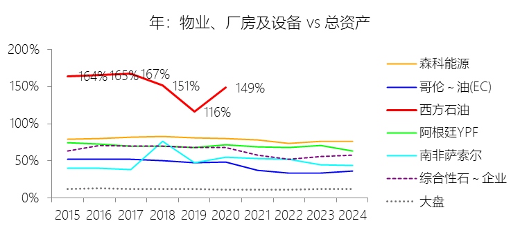 物业、厂房及设备:2025年末,西方石油的物业、厂房及设备缺数据,与总资产的比例无效;2015-2024年(十年),此项合计为5221.78美元,平均比例为78.32%,比综合性石油与天然气企业行业的均值高15.27个百分点,长期呈下降趋势。