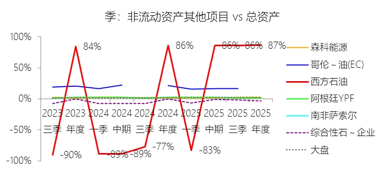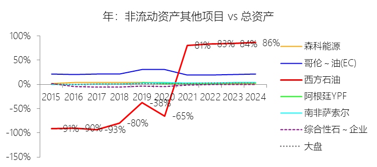 非流动资产其他项目:2025年末,西方石油的非流动资产其他项目为728.84亿美元,对比年初减少1.15%,与总资产的比例为86.57%,同比上升0.29个百分点;2015-2024年(十年),此项合计为123.42亿美元,平均比例为1.85%,比综合性石油与天然气企业行业的均值高4.23个百分点,长期呈上升趋势。