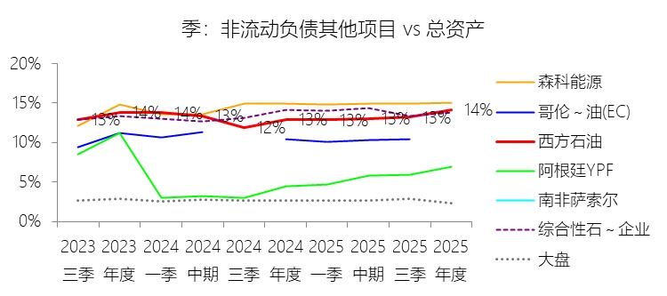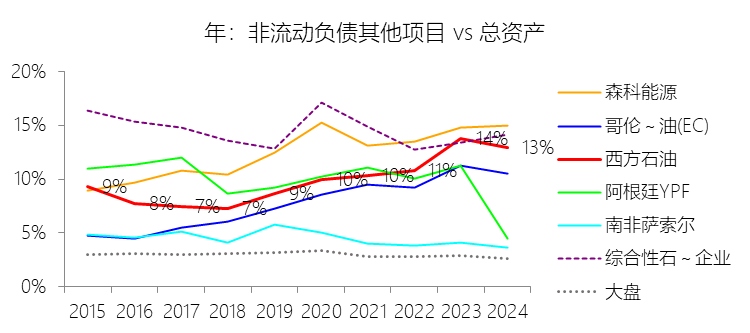 非流动负债其他项目:2025年末,西方石油的非流动负债其他项目为119.01亿美元,对比年初增长7.5%,与总资产的比例为14.14%,同比上升1.18个百分点;2015-2024年(十年),此项合计为679.65亿美元,平均比例为10.19%,比综合性石油与天然气企业行业的均值低4.28个百分点,长期呈上升趋势。