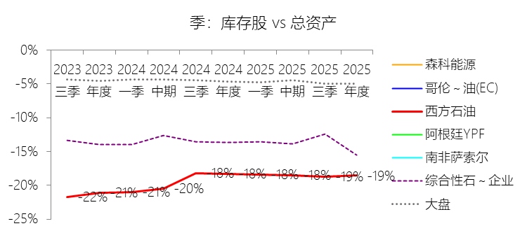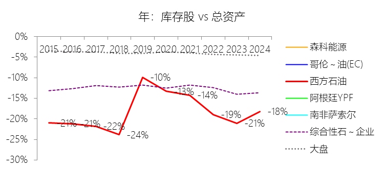 库存股:2025年末,西方石油的库存股为-155.97亿美元,绝对值对比年初无增长,与总资产的比例为-18.53%,同比下降0.27个百分点;2015-2024年(十年),此项合计为-1148.47亿美元,平均比例为-17.22%,比综合性石油与天然气企业行业的均值低4.62个百分点,长期呈上升趋势。