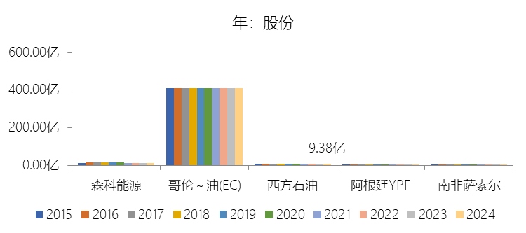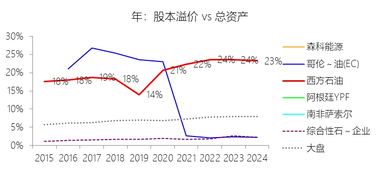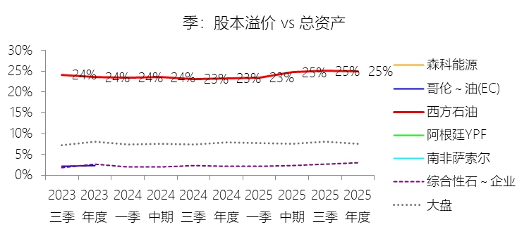 股本溢价:2025年末,西方石油的股本溢价为210.08亿美元,对比年初增长5.74%,与总资产的比例为24.95%,同比上升1.7个百分点;2015-2024年(十年),此项合计为1340.44亿美元,平均比例为20.10%,比综合性石油与天然气企业行业的均值高18.3个百分点,长期呈上升趋势。