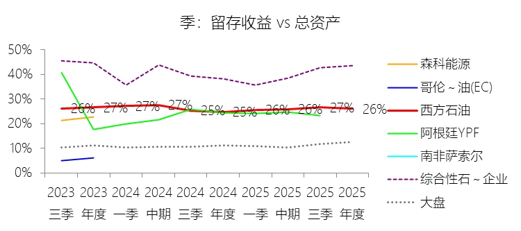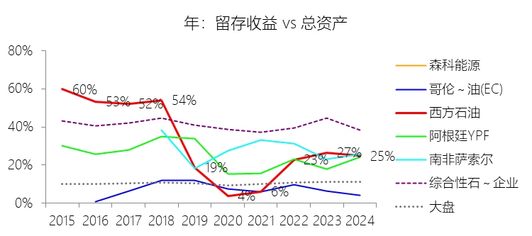 留存收益:2025年末,西方石油的留存收益为218.91亿美元,对比年初增长3.31%,与总资产的比例为26.00%,同比上升1.2个百分点;2015-2024年(十年),此项合计为1795.96亿美元,平均比例为26.94%,比综合性石油与天然气企业行业的均值低14.04个百分点,长期呈下降趋势。