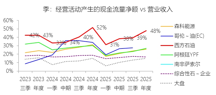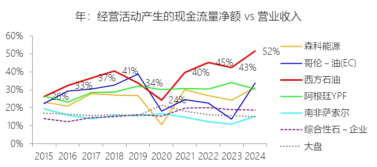 经营活动产生的现金流量净额:2025年,西方石油的经营活动产生的现金流量净额为105.32亿美元,同比减少7.93%,与营业收入的比例为47.71%,同比下降3.83个百分点;2015-2024年(十年),此项合计为815.86亿美元,平均比例为39.25%,比综合性石油与天然气企业行业的均值高22.31个百分点,长期呈上升趋势。比例短期下降主要由于公司在2025年面临较高的营运资本流出,特别是因2024年飓风“贝丽尔”(Hurricane Beryl)相关的联邦灾害救济程序而推迟的部分税款在2025年集中支付,加上应付账款及预提负债的支付时点变动,且2025年缺少了2024年同期包含的安第斯仲裁(Andes Arbitration)法律结算所带来的大额现金流入,导致经营现金流的降幅超过了因原油实现价格下跌导致的收入降幅;比例长期上升主要由于公司自2019年及2024年分别完成对阿纳达科和CrownRock的重大并购后,通过剥离加纳、哥伦比亚等非核心资产,将资源彻底聚焦于全球最具现金边际贡献的二叠纪盆地核心区,显著提升了单位产量的现金获取能力,同时随着资产规模倍增,每年计提的高额折旧、损耗及摊销(DD&A)作为非现金项在现金流量表中被大量加回,驱动了经营现金流占比的稳步扩张;比例高于综合性石油与天然气企业行业的均值主要由于西方石油作为纯粹的上游及化学巨头,其拥有的二叠纪盆地资产具有极低的损益平衡点和行业领先的资本强度,其业务的现金利润率天然高于含有大量低毛利炼化中下游业务的综合性石油巨头,且公司在过去十年间因应对低油价周期计提了累计超过200亿美元的巨额非现金资产减值准备,这些减值以及高于行业平均水平的折旧回加项显著放大了经营现金流相对于营业收入的账面比例。