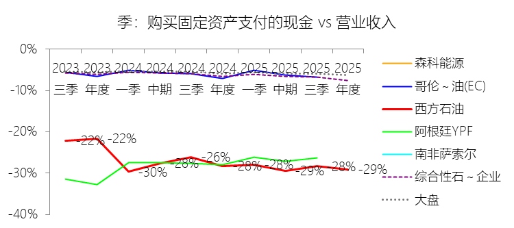 购买固定资产支付的现金:2025年,西方石油的购买固定资产支付的现金为-64.27亿美元,绝对值同比增长2.62%,与营业收入的比例为-29.11%,同比下降0.9个百分点;2015-2024年(十年),此项合计为-453.65亿美元,平均比例为-21.83%,比综合性石油与天然气企业行业的均值低15.59个百分点,长期呈上升趋势。