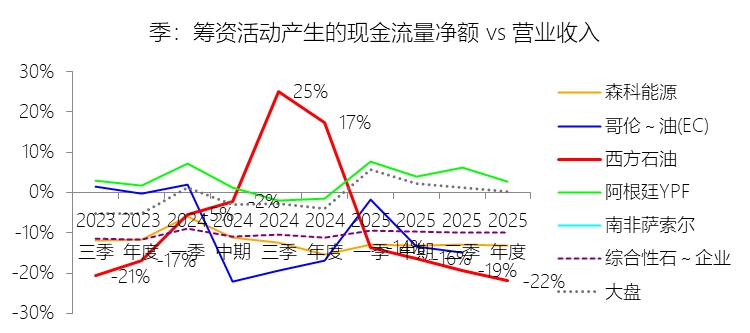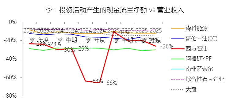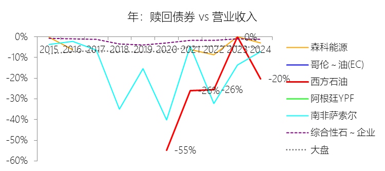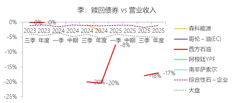 赎回债券:2025年,西方石油的赎回债券为-37.54亿美元,绝对值同比减少16.84%,与营业收入的比例为-17.01%,同比上升3.33个百分点;2015-2024年(十年),此项合计为-297.70亿美元,平均比例为-14.32%,比综合性石油与天然气企业行业的均值低12.46个百分点,长期呈上升趋势。