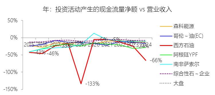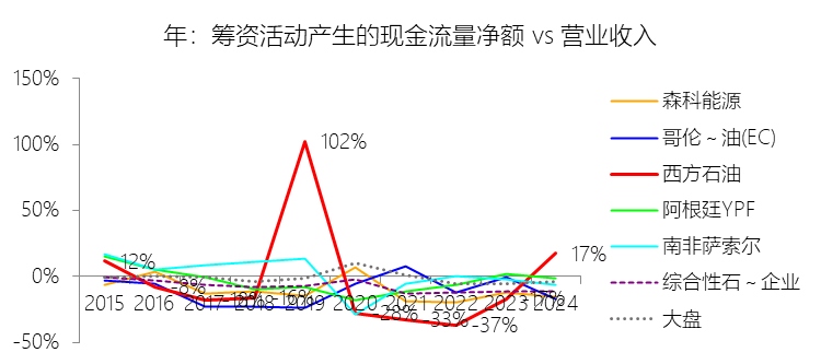 投资活动产生的现金流量净额:2025年,西方石油的投资活动产生的现金流量净额为-57.99亿美元,绝对值同比减少60.25%,与营业收入的比例为-26.27%,同比上升39.47个百分点;2015-2024年(十年),此项合计为-739.92亿美元,平均比例为-35.60%,比综合性石油与天然气企业行业的均值低27.2个百分点,长期呈上升趋势。比例短期上升主要由于公司在2024年支付了收购CrownRock约88亿美元的巨额现金对价,而2025年仅有约2.8亿美元的资产购买支出,加之2025年公司加大了非核心资产剥离力度,通过出售二叠纪盆地权益、DJ盆地非经营性矿区以及部分集输资产,实现了约23亿美元的资产处置现金回笼,显著冲抵了同年约64亿美元的资本开支,导致投资活动现金净流出规模大幅收窄;比例长期上升主要由于公司自2019年完成对阿纳达科的世纪收购后,战略重点彻底转向去杠杆与资本效率优化,通过实施累计总额超过150亿美元的全球资产剥离计划(如退出加纳、哥伦比亚及持续减持WES单位),并将资本支出精准锁定在二叠纪盆地等高回报的核心区,这种从“激进扩张”向“资产瘦身及高效运营”的转型,驱动了投资净流出占收入的比例在波动中回升;比例低于综合性石油与天然气企业行业的均值主要由于西方石油在过去十年内连续发起了阿纳达科(2019年)和CrownRock(2024年)两次行业顶级的并购活动,由此产生的爆发式现金流出基数远超同行业的平均内生增长水平,且公司业务高度集中于资本密集型、高衰减率的页岩油气上游开发领域,其维持和扩张产量的单位资本强度天然高于拥有庞大且稳定的炼化、零售等下游业务资产的传统综合性石油巨头。