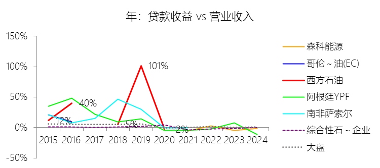 贷款收益:2025年,西方石油的贷款收益缺数据,与营业收入的比例无效;2015-2024年(十年),此项合计为282.89美元,平均比例为13.61%,比综合性石油与天然气企业行业的均值高13.51个百分点,长期呈上升趋势。