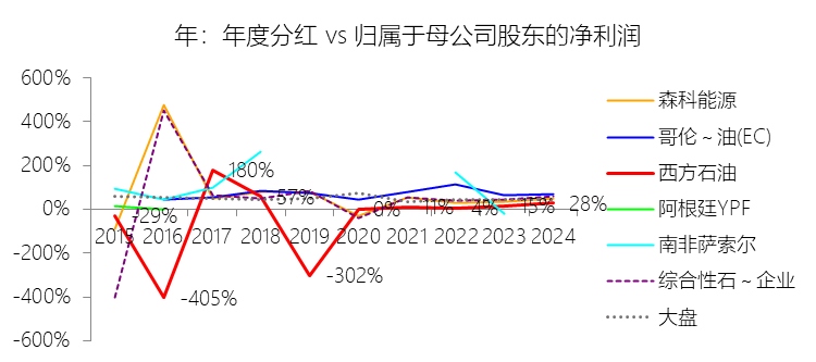 年度分红:2024年,西方石油的年度分红为8.67亿美元,同比增长22.63%,与归属于母公司股东的净利润的比例为28.38%(分红率),同比上升13.32个百分点;2015-2024年(十年),此项合计为137.74亿美元,平均比例为280.01%,比综合性石油与天然气企业行业的均值高206.74个百分点,长期呈上升趋势。
