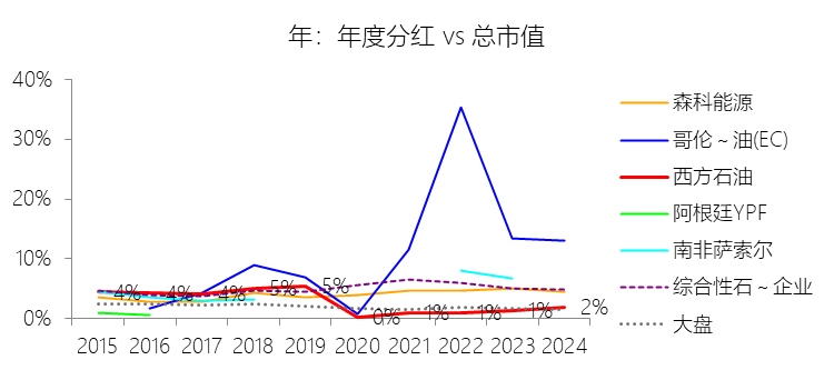 股息率:2024年,西方石油的股息率为1.87%,同比上升0.52个百分点;2015-2024年(十年),平均股息率为3.10%,比综合性石油与天然气企业行业的均值低1.89个百分点,长期呈下降趋势。