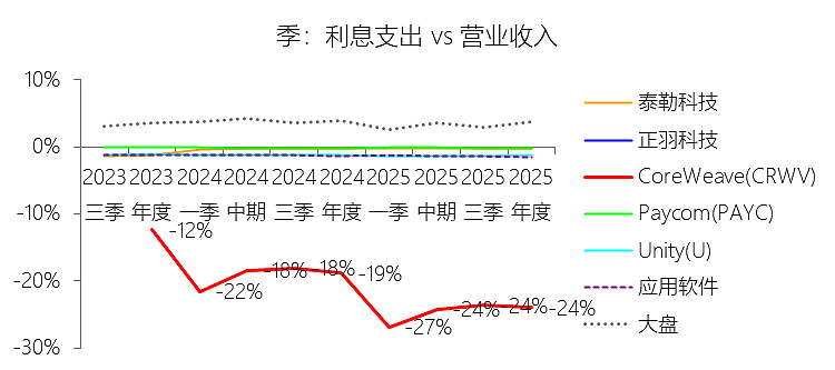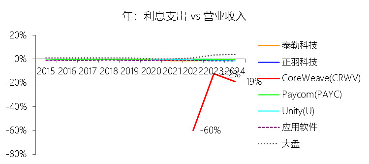 利息支出:2025年,CoreWeaveInc-A的利息支出为-12.29亿美元,绝对值同比增长240.61%,与营业收入的比例为-23.95%,同比下降5.11个百分点;2015-2024年(十年),此项合计为-3.99亿美元,平均比例为-18.46%,比应用软件行业的均值低17.38个百分点,长期呈上升趋势。比例短期下降主要由于虽然2025年营业收入实现了167.88%的强劲增长,但其利息支出绝对值的增长速度(240.61%)更为剧烈,导致利息对营收的占比进一步扩大(即比例数值下降);这种支出的激增直接源于公司为支持43个数据中心的快速部署而承担了巨额债务,仅2025年就发行了总计64亿美元的高级票据,并大幅增加了在延迟提款定期贷款(DDTL)项下的借款,使年底总债务规模攀升至216.15亿美元。比例长期上升主要由于公司从早期小规模业务转型为全球领先的AI云计算基础设施提供商,业务模式转变为极度依赖资本投入的扩张路径;为了在AI算力竞赛中抢占先机,公司持续通过大规模举债筹集资金以采购最先进的英伟达GPU集群并建设电力密集型数据中心,这种“先投入、后创收”的重资产扩张模式导致其长期利息义务随融资规模的爆发而持续增加,但增幅不如营业收入,导致利息对营收的占比上升(即比例数值上升)。比例低于应用软件行业的均值主要由于CoreWeave作为“AI核心云”,其业务属性与轻资产的传统应用软件行业有本质区别,后者通常拥有稳定的现金流且资本性开支较小;相比之下,公司正处于向AI原生技术栈投入数百亿美元的关键期,其高杠杆的融资结构——包括资产级债务和昂贵的融资租赁——产生了极其沉重的利息偿付压力,这使得其利息支出占营收比例远低于(即负向程度远深于)那些拥有健康利润率且债务负担极轻的应用软件行业同行。