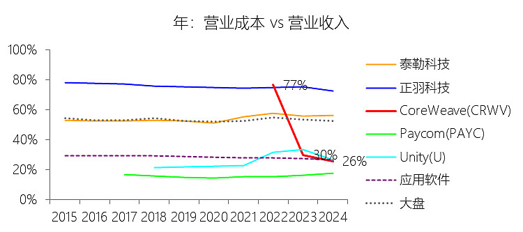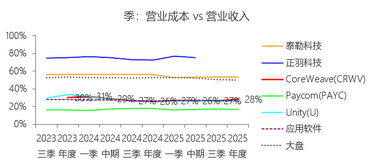 营业成本:2025年,CoreWeaveInc-A的营业成本为14.53亿美元,同比增长194.52%,与营业收入的比例为28.32%(营业成本率,即1-毛利率),同比上升2.56个百分点;2015-2024年(十年),此项合计为5.74亿美元,平均比例为26.58%,比应用软件行业的均值低1.53个百分点,长期呈下降趋势。