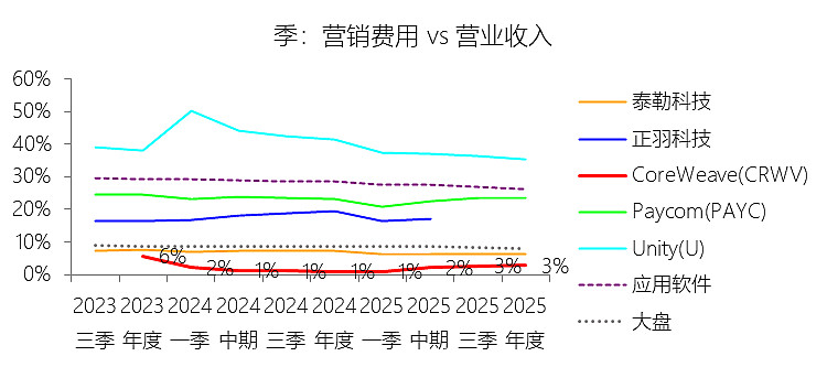 营销费用:2025年,CoreWeaveInc-A的营销费用为1.44亿美元,同比增长683.08%,与营业收入的比例为2.81%,同比上升1.85个百分点;2015-2024年(十年),此项合计为0.34亿美元,平均比例为1.56%,比应用软件行业的均值低28.15个百分点,长期呈下降趋势。