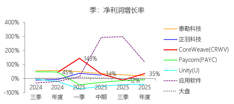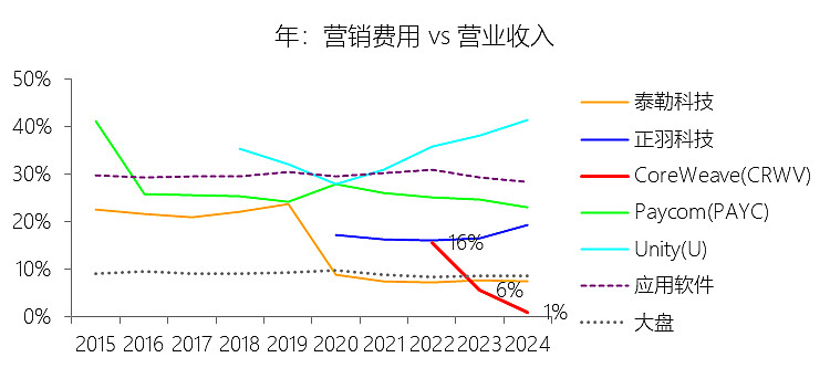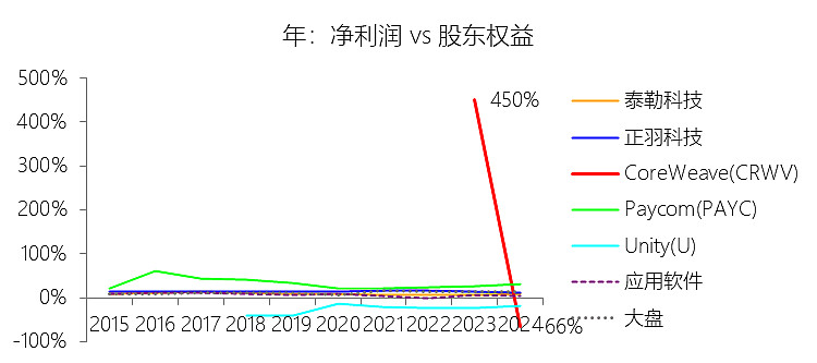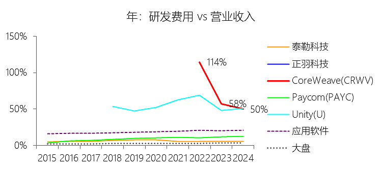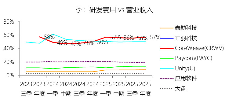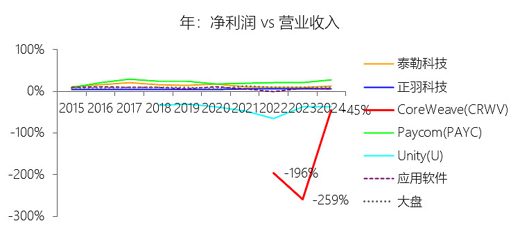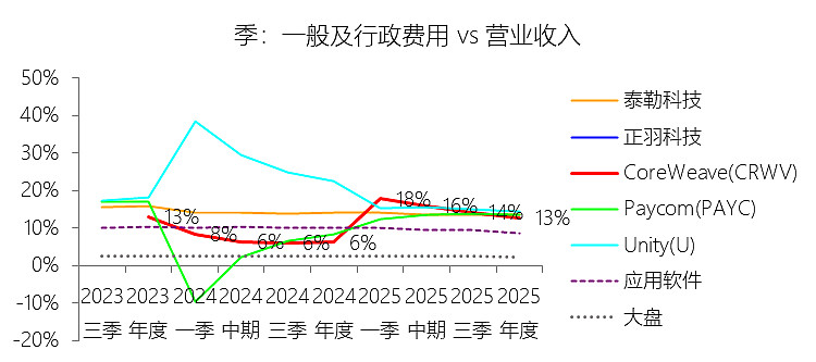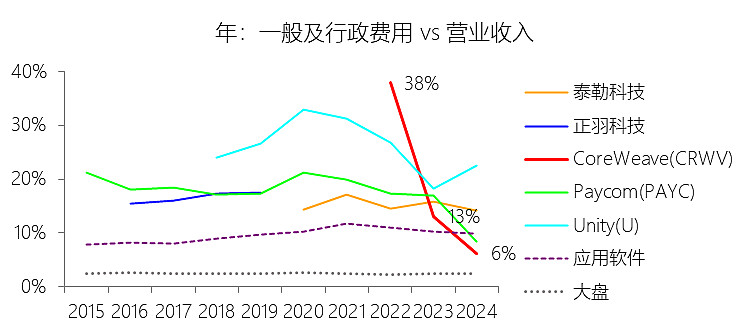 一般及行政费用:2025年,CoreWeaveInc-A的一般及行政费用为6.51亿美元,同比增长448.7%,与营业收入的比例为12.69%,同比上升6.49个百分点;2015-2024年(十年),此项合计为1.54亿美元,平均比例为7.15%,比应用软件行业的均值低2.88个百分点,长期呈下降趋势。
