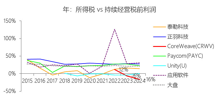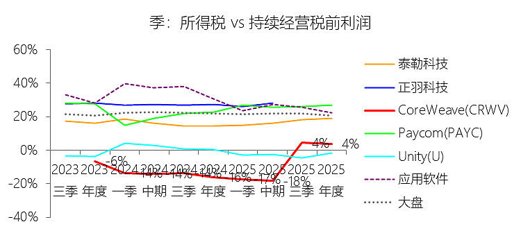 所得税率:2025年,CoreWeaveInc-A的所得税为-0.48亿美元,与持续经营税前利润的比例为3.95%(所得税率),同比上升19.97个百分点;2015-2024年(十年),此项合计为1.51亿美元,平均比例为-11.28%,比应用软件行业的均值低38.21个百分点,长期呈下降趋势。