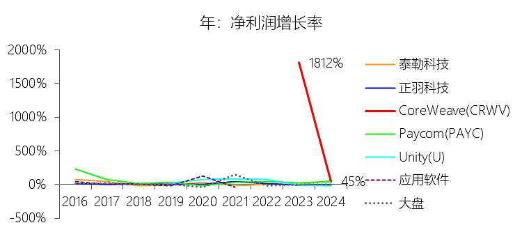 营业收入增长率:2025年,CoreWeaveInc-A的营业收入为51.31亿美元,同比增长167.88%,增速同比下降568.76个百分点;2015-2024年(九年)增长11999.97%,年复合增长1000%,比应用软件行业的复合增速高983.27个百分点,长期呈下降趋势。增速短期下降主要由于公司业务基数的显著扩大以及业务成熟度的提高,早期极高的增长率在很大程度上源于从较小规模起步的“基数效应”,且随着收入规模迈向50亿美元大关,维持超高增速的难度必然增加;同时,尽管2025年收入增长主要由现有客户群的扩张和新数据中心的部署驱动,但快速扩张过程中对管理、运营及财务资源产生的巨大压力,以及数据中心和电力供应等基础设施交付周期的限制,也对短期增速产生了平抑作用。增速长期下降主要由于随着业务趋于成熟,市场渗透率逐步达到高点,且AI云计算市场竞争日益白热化,来自亚马逊、谷歌和微软等拥有更雄厚财力和技术资源的超大规模云服务商的激烈竞争,可能会削弱公司的市场份额和定价权;此外,AI技术的进步(如开源模型和计算效率的提升)可能减少对硬件资源的单位需求,且未来AI算力需求若出现平台期或向边缘计算转移,也将导致集中式云服务收入增速的放缓。增速显著高于应用软件行业复合增速的主要原因在于,公司作为“AI核心云”,其业务深度绑定于AI原生技术栈和高性能计算领域,通过提供最先进的GPU集群和专有的编排软件,直接捕捉到了全球大模型训练与推理需求爆发式的增长红利;相比处于成熟期或受宏观经济波动影响较大的传统应用软件行业,CoreWeave凭借与英伟达等核心供应商的紧密合作及在算力基础设施领域的领先部署能力,使其能够满足领先AI实验室和大型企业对高性能算力的刚性需求,从而在AI行业高速发展的上升期实现远超行业均值的成长潜能。