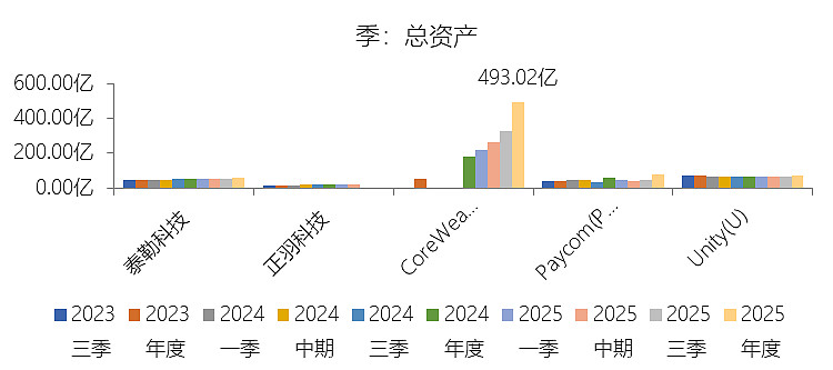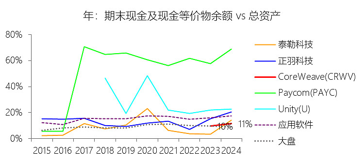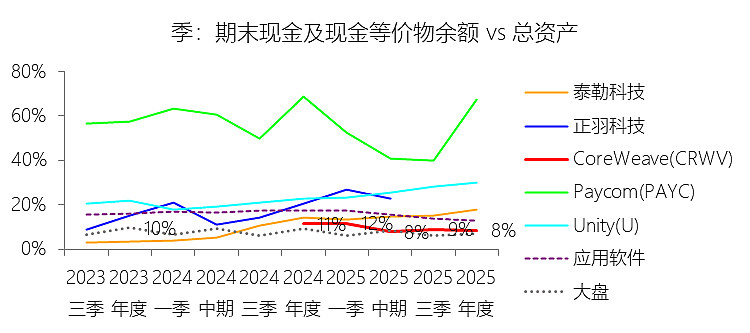 期末现金及现金等价物余额:2025年末,CoreWeaveInc-A的期末现金及现金等价物余额为41.30亿美元,对比年初增长102.87%,与总资产的比例为8.38%,同比下降3.04个百分点;2015-2024年(十年),此项合计为25.23亿美元,平均比例为11.06%,比应用软件行业的均值低4.95个百分点,长期呈上升趋势。