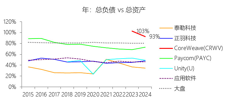 负债率:2025年末,CoreWeaveInc-A的总负债为459.67亿美元,对比年初增长178.18%,与总资产的比例为93.24%(负债率),同比上升0.57个百分点;2015-2024年(十年),此项合计为216.33亿美元,平均比例为94.84%,比应用软件行业的均值高47.14个百分点,长期呈下降趋势。比例短期上升主要由于2025年公司负债增速(178.18%)略微超过了同期总资产增速(176.47%),其核心驱动力是公司为支撑43个数据中心部署而采取的激进融资策略:仅2025年便密集发行了包括2030年到期高级票据、2031年到期高级票据及可转债在内共计64亿美元的债务工具,且DDTL Facilities项下的借款规模及OEM设备融资额大幅攀升;同时,由于大规模采购带来的应计采购额从2024年的1.06亿美元骤增至51.96亿美元,导致应付账款及应计费用显著膨胀,这种多元化负债的密集积累在会计期末微幅推高了负债率。比例长期下降主要由于公司资本结构随业务成熟和上市进程而发生质变,早期极高的负债率主要受经营规模极小且高度依赖初期债务融资影响(2023年曾高达102.65%);随着2025年3月IPO的完成,原本作为中间项核算的17.22亿美元可赎回可转换优先股全部转为普通股权益,加之IPO募集的约14.9亿美元净资金及大规模股权激励产生的股本溢价,极大地充实了股东权益基数,从而在长期趋势上对冲了债务规模的绝对增长。比例高于应用软件行业的均值主要由于CoreWeave作为“AI核心云”具有极强的重资产属性,其业务高度依赖数以万计的英伟达GPU集群等实物硬件,这与普遍采用轻资产模式、依赖知识产权和人力资本的应用软件行业有本质区别;公司主要利用以资产为抵押的“先投入、后创收”模式进行扩张,其总负债中包含了大量应用软件企业通常无需承担的巨额DDTL债务、昂贵的融资租赁义务以及为抢占算力先机而背负的大规模设备采购债务,这种高杠杆的融资结构直接服务于AI原生技术栈的快速扩建,导致其负债率结构性地维持在远超传统软件企业的水平。