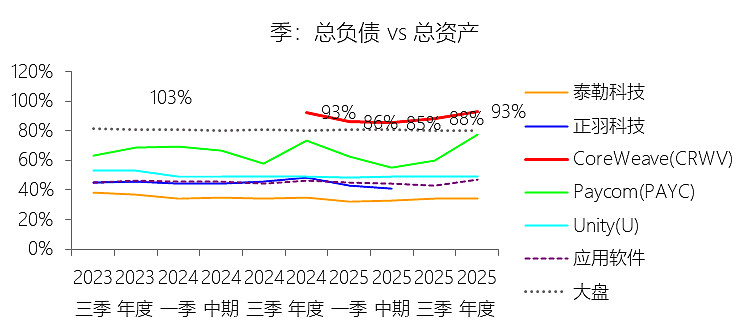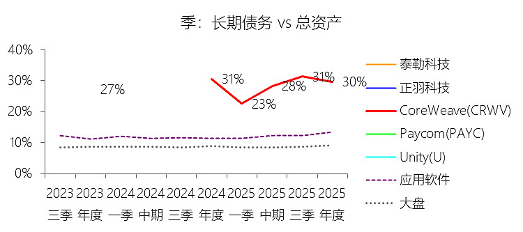 长期债务:2025年末,CoreWeaveInc-A的长期债务为146.65亿美元,对比年初增长168.69%,与总资产的比例为29.75%,同比下降0.86个百分点;2015-2024年(十年),此项合计为68.09亿美元,平均比例为29.85%,比应用软件行业的均值高19.18个百分点,长期呈上升趋势。