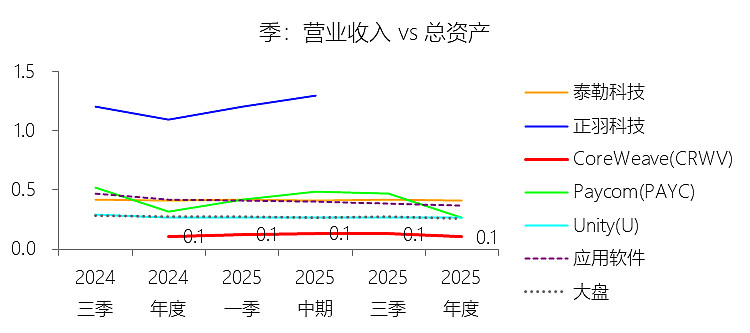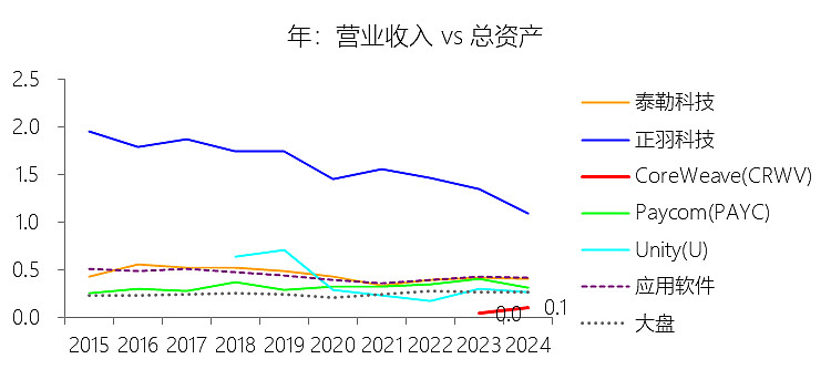 总资产周转率:2025年,CoreWeaveInc-A的总资产周转率为0.1次,同比略微下降;2015-2024年(十年),平均总资产周转率为0.1次,比应用软件行业的均值低0.33次,长期呈上升趋势。
