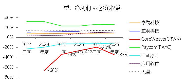 净利率:2025年,CoreWeaveInc-A的净利润为-11.67亿美元,绝对值同比增长35.16%,与营业收入的比例为-22.74%(净利率),同比上升22.33个百分点;2015-2024年(十年),此项合计为-14.88亿美元,平均比例为-68.89%,比应用软件行业的均值低75.34个百分点,长期呈上升趋势。比例短期上升主要由于2025年营业收入实现了167.88%的爆发式增长,其增速远超净亏损绝对值的增幅(35.16%),产生了显著的规模效应来稀释固定支出比例。同时,财务表现受非经营性因素利好影响较大,公允价值变动损益从2024年的7.56亿美元亏损大幅扭转为2025年的0.27亿美元收益;此外,受2025年7月颁布的《OBBBA法案》利好,公司由去年的所得税支出转为今年的所得税收益,这种税收政策变动大幅收窄了净利率的亏损幅度。比例长期上升主要由于公司业务从早期极小规模(甚至包含已停办的加密货币业务)向全球领先的AI云计算基础设施商成功转型,随着43个数据中心逐步投产,前期沉淀的高额固定资产投入和运营成本开始被更快速增长的营收所摊薄,体现了业务规模化进程中盈利能力的持续修复趋势。比例低于应用软件行业的均值主要由于CoreWeave具有极高的资本密集型属性,与轻资产的传统应用软件行业不同,公司为建设AI原生技术栈需承担巨额的硬件折旧(如GPU集群)、昂贵的电力和数据中心租赁成本,导致其营销费用率、管理费用率和研发费用率远高于行业均值。此外,为了支持扩张而承担的超过216亿美元巨额债务产生了沉重的利息支出(2025年达12.29亿美元),加之公司正处于抢占技术霸权的投入期,高额的研发开支和基于股票的补偿费用显著侵蚀了账面利润;由于应用软件行业均值多由处于成熟期、拥有稳定利润流的企业贡献,而公司仍处于持续加大投入以获取领导力的亏损扩张阶段,导致其利润比例远低于行业平均水平。
