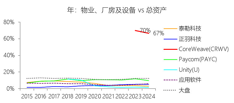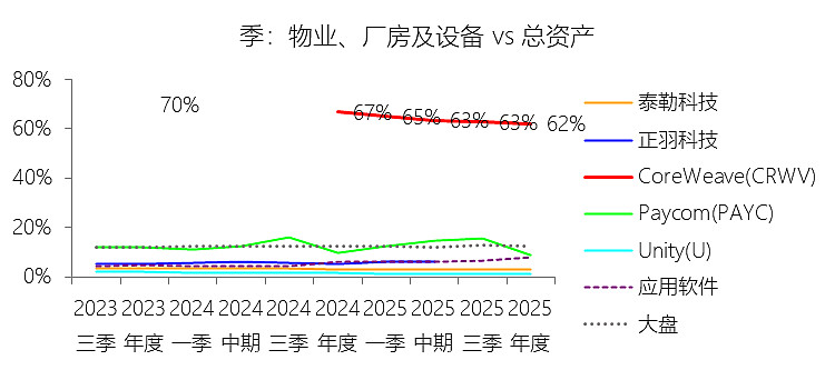 物业、厂房及设备:2025年末,CoreWeaveInc-A的物业、厂房及设备为305.57亿美元,对比年初增长156.46%,与总资产的比例为61.98%,同比下降4.84个百分点;2015-2024年(十年),此项合计为153.99亿美元,平均比例为67.51%,比应用软件行业的均值高62.27个百分点,长期呈下降趋势。