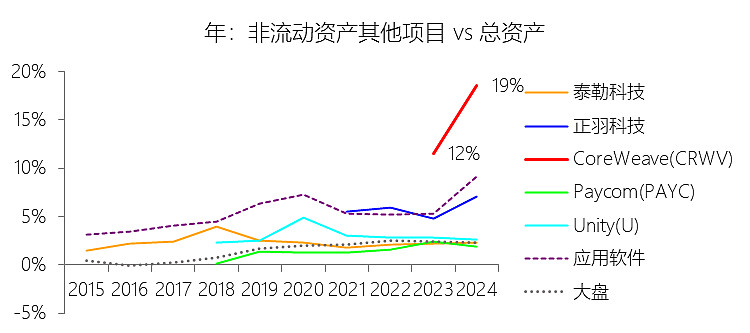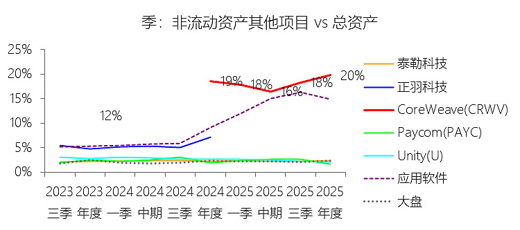 非流动资产其他项目:2025年末,CoreWeaveInc-A的非流动资产其他项目为97.37亿美元,对比年初增长194.13%,与总资产的比例为19.75%,同比上升1.19个百分点;2015-2024年(十年),此项合计为38.83亿美元,平均比例为17.02%,比应用软件行业的均值高11个百分点,长期呈上升趋势。