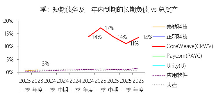 短期债务及一年内到期的长期负债:2025年末,CoreWeaveInc-A的短期债务及一年内到期的长期负债为67.08亿美元,对比年初增长171.75%,与总资产的比例为13.61%,同比下降0.24个百分点;2015-2024年(十年),此项合计为26.40亿美元,平均比例为11.58%,比应用软件行业的均值高10.67个百分点,长期呈上升趋势。