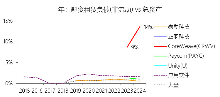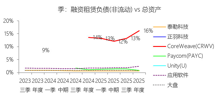 融资租赁负债(非流动):2025年末,CoreWeaveInc-A的融资租赁负债(非流动)为79.84亿美元,对比年初增长229.5%,与总资产的比例为16.19%,同比上升2.61个百分点;2015-2024年(十年),此项合计为28.56亿美元,平均比例为12.52%,比应用软件行业的均值高10.89个百分点,长期呈上升趋势。