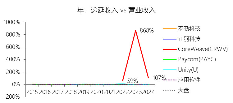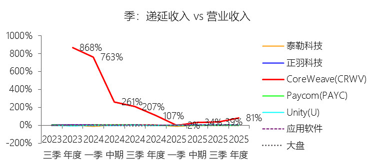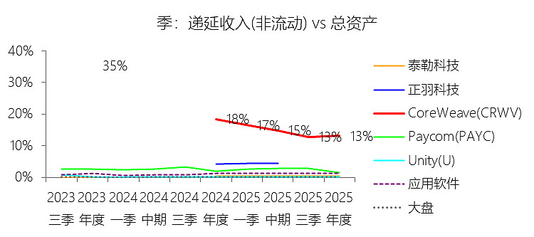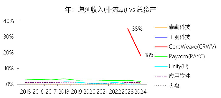 递延收入:2025年,CoreWeaveInc-A的递延收入为41.74亿美元,同比增长103.7%,与营业收入的比例为81.35%,同比下降25.63个百分点;2015-2024年(十年),此项合计为40.45亿美元,平均比例为187.24%,比应用软件行业的均值高184.46个百分点,长期呈上升趋势。
