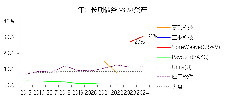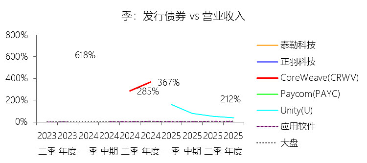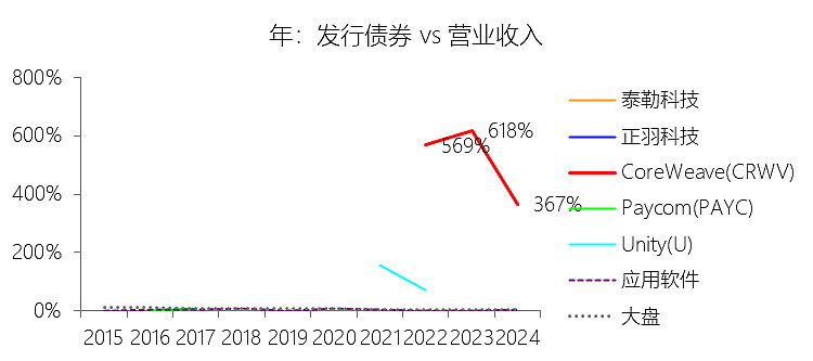 发行债券:2025年,CoreWeaveInc-A的发行债券缺数据,与营业收入的比例无效;2015-2024年(十年),此项合计为85.28美元,平均比例为394.79%,比应用软件行业的均值高391.17个百分点,长期呈下降趋势。