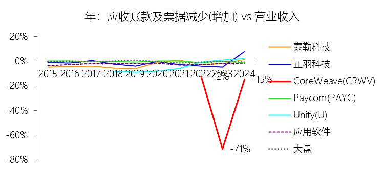 应收账款及票据减少(增加):2025年,CoreWeaveInc-A的应收账款及票据减少(增加)为-27.49亿美元,绝对值同比增长882.77%,与营业收入的比例为-53.58%,同比下降38.97个百分点;2015-2024年(十年),此项合计为-4.44亿美元,平均比例为-20.55%,比应用软件行业的均值低18.46个百分点,长期呈下降趋势。