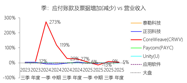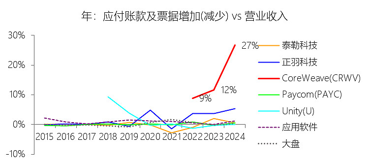 应付账款及票据增加(减少):2025年,CoreWeaveInc-A的应付账款及票据增加(减少)为2.53亿美元,同比减少50.45%,与营业收入的比例为4.93%,同比下降21.72个百分点;2015-2024年(十年),此项合计为5.39亿美元,平均比例为24.94%,比应用软件行业的均值高24.06个百分点,长期呈上升趋势。