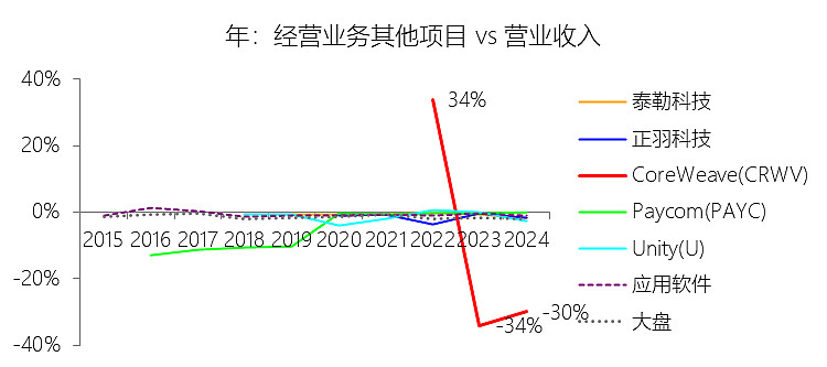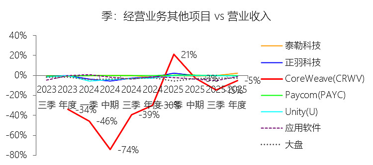 经营业务其他项目:2025年,CoreWeaveInc-A的经营业务其他项目为-2.62亿美元,绝对值同比减少54.26%,与营业收入的比例为-5.11%,同比上升24.8个百分点;2015-2024年(十年),此项合计为-6.46亿美元,平均比例为-29.88%,比应用软件行业的均值低29.13个百分点,长期呈下降趋势。