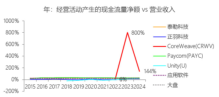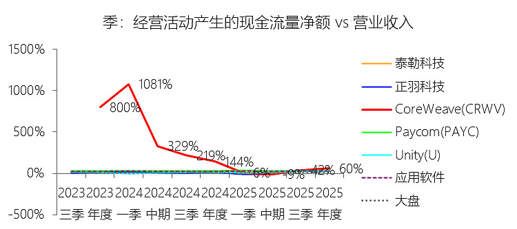 经营活动产生的现金流量净额:2025年,CoreWeaveInc-A的经营活动产生的现金流量净额为30.58亿美元,同比增长11.23%,与营业收入的比例为59.60%,同比下降83.93个百分点;2015-2024年(十年),此项合计为45.83亿美元,平均比例为212.14%,比应用软件行业的均值高189.15个百分点,长期呈上升趋势。比例短期下降主要由于2025年营业收入实现了167.88%的爆发式增长,而经营现金流绝对值的增速(11.23%)显著滞后,导致其对营收的占比被大幅稀释。这种增速错位的主要驱动力在于,尽管新签及扩展合同带来了可观的客户预付款,但随着业务规模的极速扩张,应收账款(净增加额)从2024年的2.8亿美元骤增至2025年的27.49亿美元,这种未结清款项的大幅积压显著抵消了经营性现金流入的增长。比例长期上升主要由于公司从早期小规模经营及已停办的加密货币业务成功转型为AI云计算基础设施领军者,其商业模式发生了根本性变革。随着43个数据中心逐步投产,公司通过与Meta、OpenAI等巨头建立长期战略合作,获取了稳定的现金流回收机制,这种从投入期向大规模创收期跨越的过程,带动了经营现金流规模随业务成熟度的提高而持续攀升。比例高于应用软件行业的均值主要由于CoreWeave作为“AI核心云”具有极强的重资产属性和特有的融资模式,与轻资产的应用软件行业存在本质区别。公司普遍采用包含15%至25%高比例预付款的“带走或支付”(take-or-pay)长期承诺合同,这种在服务交付前先行获取巨额现金的机制,产生了远超软件行业常规订阅模式的现金流贡献。此外,由于公司处于算力竞赛巅峰期,账面存在巨额的非现金费用,仅2025年折旧与摊销就高达24.54亿美元,加之6.3亿美元的股权激励费用,这些项目虽然侵蚀利润但在计算经营现金流时需全额加回,配合递延收入(预收款)在2025年末达到82亿美元的规模,共同使得其经营现金流比例结构性地维持在极高水平。