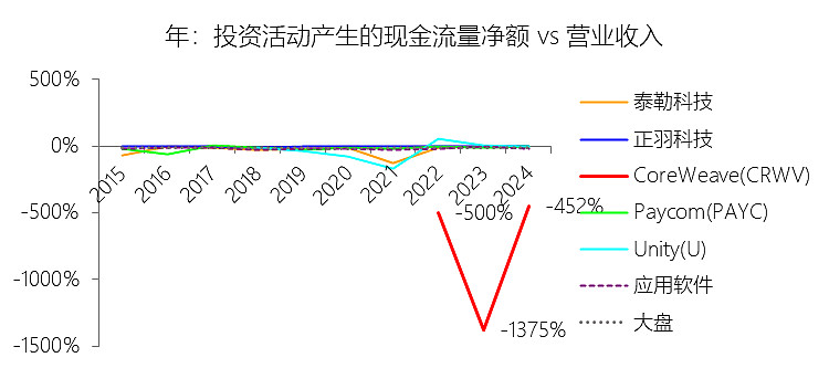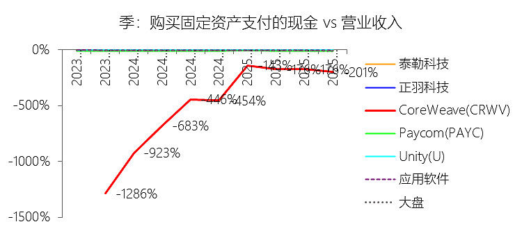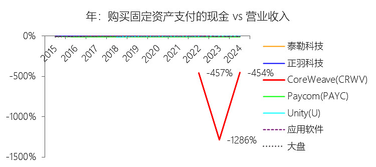 购买固定资产支付的现金:2025年,CoreWeaveInc-A的购买固定资产支付的现金为-103.09亿美元,绝对值同比增长18.47%,与营业收入的比例为-200.92%,同比上升253.4个百分点;2015-2024年(十年),此项合计为-117.18亿美元,平均比例为-542.43%,比应用软件行业的均值低539.41个百分点,长期呈上升趋势。