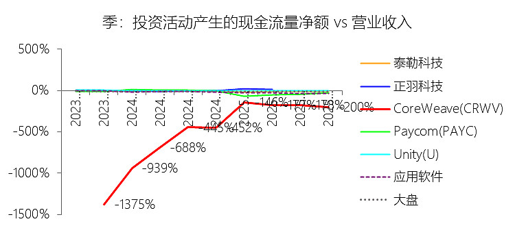 投资活动产生的现金流量净额:2025年,CoreWeaveInc-A的投资活动产生的现金流量净额为-102.71亿美元,绝对值同比增长18.63%,与营业收入的比例为-200.18%,同比上升251.84个百分点;2015-2024年(十年),此项合计为-118.85亿美元,平均比例为-550.18%,比应用软件行业的均值低531.79个百分点,长期呈上升趋势。比例短期上升主要由于2025年营业收入实现了167.88%的爆发式增长,而同期投资活动产生的现金流出绝对值仅增长了18.63%,其核心支出项“购买固定资产支付的现金”增速(18.47%)也远低于营收增速;这种收入扩张速度与资本开支节奏的错位,使得原本巨额的投资支出在快速膨胀的营收基数下被显著稀释,从而推高了比例数值。比例长期上升主要由于公司自2022年从加密货币业务成功转型为AI云计算基础设施提供商后,业务重心转向了极度依赖硬件投入的扩张模式;在转型初期的2023年,由于公司需在创收前先行完成大规模GPU集群部署,导致投资流出占营收比重曾深跌至-1374.89%的极端水平,但随着43个数据中心逐步投产并进入高额回报期,营收实现了从0.16亿美元到51.31亿美元的万倍计跨越,这种前期巨额投入后的规模化创收效应使得该比例从早期的非理性低点持续回升并趋于修复。比例低于应用软件行业的均值主要由于CoreWeave作为“AI核心云”,其业务本质属于重资产的基础设施运营,与普遍采用轻资产模式的应用软件行业存在天然鸿沟;公司为了维持在AI算力竞赛中的领导地位并实现“首发”英伟达最新架构算力,必须持续投入数以百亿美元计的现金用于采购 property and equipment(尤其是昂贵的GPU服务器和网络设备),2025年此项支出就高达103.09亿美元,导致其物业、厂房及设备(PP&E)占总资产比例高达61.98%;相比之下,应用软件行业主要依赖知识产权及人力研发,缺乏如此巨大的实物资产投资压力,这使得CoreWeave在追求AI原生技术栈霸权的过程中,投资活动现金流出占比结构性地远高于那些无需大规模物理硬件投入的软件企业 peers。
