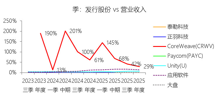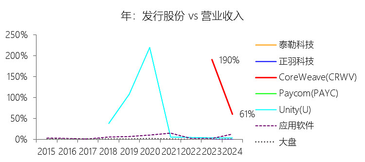 发行股份:2025年,CoreWeaveInc-A的发行股份为14.91亿美元,同比增长27.17%,与营业收入的比例为29.06%,同比下降32.15个百分点;2015-2024年(十年),此项合计为16.08亿美元,平均比例为74.44%,比应用软件行业的均值高67个百分点,长期呈下降趋势。