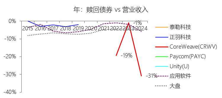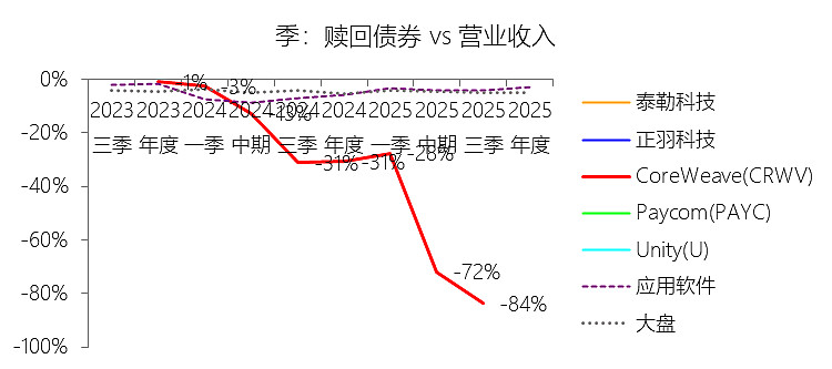 赎回债券:2025年,CoreWeaveInc-A的赎回债券缺数据,与营业收入的比例无效;2015-2024年(十年),此项合计为-5.94美元,平均比例为-27.49%,比应用软件行业的均值低23.88个百分点,长期呈下降趋势。
