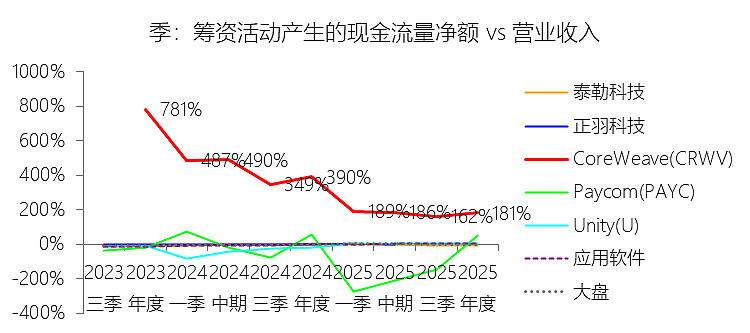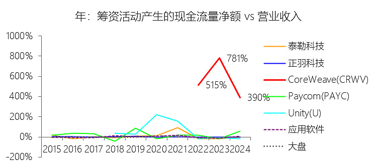 筹资活动产生的现金流量净额:2025年,CoreWeaveInc-A的筹资活动产生的现金流量净额为93.08亿美元,同比增长24.69%,与营业收入的比例为181.41%,同比下降208.31个百分点;2015-2024年(十年),此项合计为93.34亿美元,平均比例为432.08%,比应用软件行业的均值高430.8个百分点,长期呈下降趋势。**比例短期下降主要由于虽然2025年筹资活动产生的现金流净额达到了93.08亿美元的历史高位,但其24.69%的同比增速远低于同期营业收入167.88%的爆发式增长;尽管当年完成了约14.9亿美元净额的IPO募资并获得了118.29亿美元的债务发行收益,但由于公司同时支付了高达33.99亿美元的债务偿还款,导致筹资净流入的增长动能被部分抵消,在快速膨胀的营收基数下,筹资与收入的比例被显著摊薄。比例长期下降主要由于公司业务从早期极小营收基数向全球领先AI云基础设施商跨越,在2022至2023年的转型初期,由于营收极低,购建GPU集群所需的所有资金几乎全部依赖外部融资,导致筹资占比曾处于780%以上的非理性高位;随着43个数据中心逐步投产并进入规模化创收期,营收从几千万美元飞跃至50亿美元量级,这种从“完全依赖输血”向“具备自我造血能力”的转变,使得筹资活动占营收的比例随业务成熟度的提高而自然回落。比例高于应用软件行业的均值主要由于CoreWeave具有极其显著的重资产与资本密集型属性,与轻资产、低资本支出的传统应用软件行业存在本质差异;公司为了维持AI算力的代际领先并实现大规模扩张,必须通过DDTL、高级票据及OEM融资等高杠杆结构筹集巨额资金,以支撑其高达305.57亿美元的物业、厂房及设备(PP&E)投入;相比之下,应用软件企业通常拥有稳定的经营现金流且无需持续性的超大规模物理硬件投资,这种“先融资、后部署、再创收”的重资产扩张模式,决定了其筹资占比结构性地远高于那些基本无需外部大规模融资的应用软件 peers。**