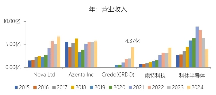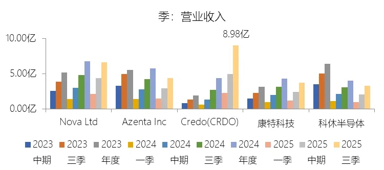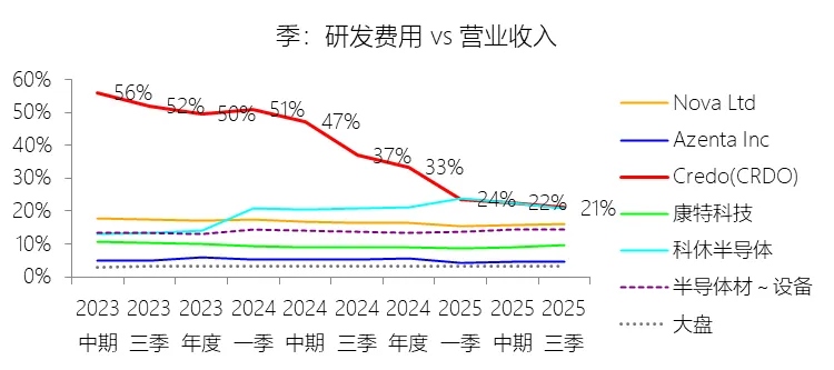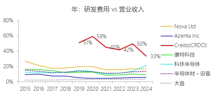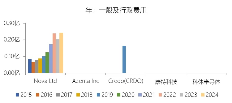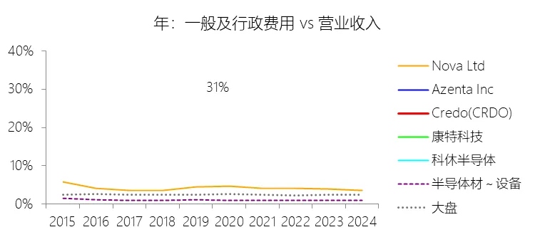 一般及行政费用:2025财年,CredoTechnologyGroupHoldingLtd的一般及行政费用缺数据,与营业收入的比例无效;2016-2025财年(十年),此项合计为0.16美元,平均比例为1.59%,比半导体材料与设备行业的均值高0.59个百分点,长期呈持平趋势。