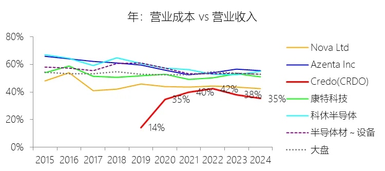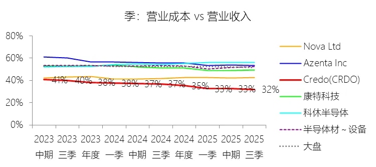 营业成本:2026财年前三季,CredoTechnologyGroupHoldingLtd的营业成本为2.88亿美元,同比增长193.62%,与营业收入的比例为32.05%(营业成本率,即1-毛利率),同比下降4.7个百分点;2016-2025财年(十年),此项合计为3.76亿美元,平均比例为36.40%,比半导体材料与设备行业的均值低18.93个百分点,长期呈上升趋势。