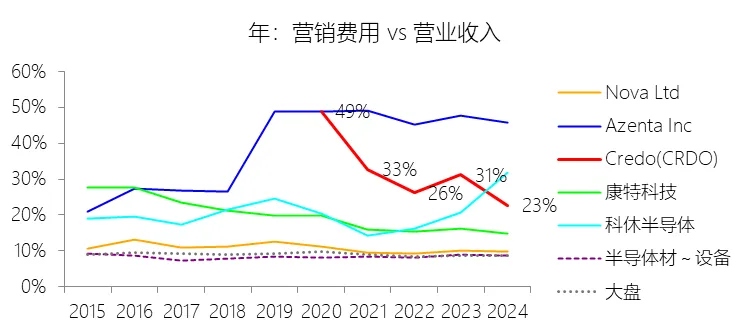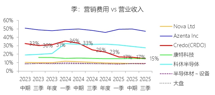 营销费用:2026财年前三季,CredoTechnologyGroupHoldingLtd的营销费用为1.32亿美元,同比增长97.5%,与营业收入的比例为14.73%,同比下降10.38个百分点;2016-2025财年(十年),此项合计为2.71亿美元,平均比例为26.23%,比半导体材料与设备行业的均值高17.8个百分点,长期呈下降趋势。