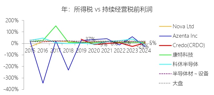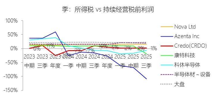 所得税率:2026财年前三季,CredoTechnologyGroupHoldingLtd的所得税为0.04亿美元,同比增长156.72%,与持续经营税前利润的比例为1.39%(所得税率),同比下降8.26个百分点;2016-2025财年(十年),此项合计为0.10亿美元,平均比例为-31.69%,比半导体材料与设备行业的均值低46.54个百分点,长期呈下降趋势。