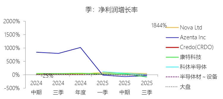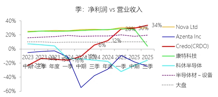 净利润增长率:2026财年前三季,CredoTechnologyGroupHoldingLtd的净利润为3.03亿美元,同比增长1844.07%,增速同比上升1844.07个百分点;2016-2025财年(九年)增长3826.49%,年复合增长108.35%,比半导体材料与设备行业的复合增速高85.48个百分点,长期呈上升趋势。