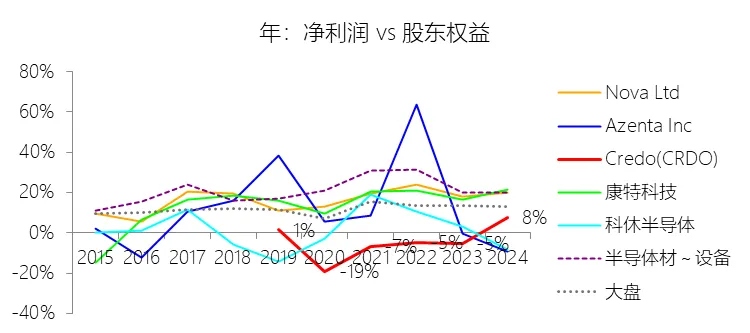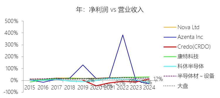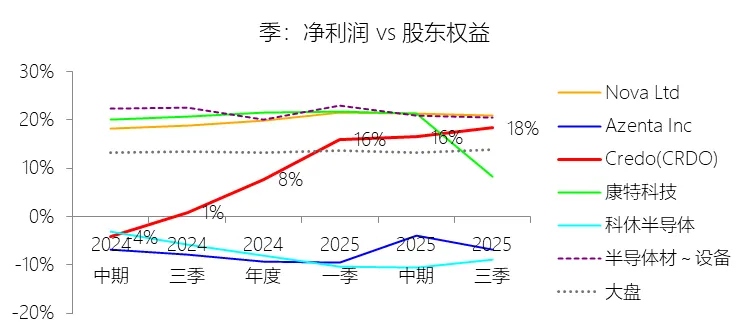 净利率:2026财年前三季,CredoTechnologyGroupHoldingLtd的净利润为3.03亿美元,同比增长1844.07%,与营业收入的比例为33.76%(净利率),同比上升27.91个百分点;2016-2025财年(十年),此项合计为-0.41亿美元,平均比例为-3.98%,比半导体材料与设备行业的均值低22.04个百分点,长期呈上升趋势。比例短期上升主要由于规模效应的显著增强和营运杠杆的有效释放。2026财年前三季,随着AEC(有源电缆)产品在超大规模数据中心客户中的持续放量,营业收入实现爆发式增长,这使得各项期间费用占收入的比重明显稀释,其中研发费用率从去年同期的36.9%大幅降至21.0%,营销费用率也从25.1%降至14.7%;同时,由于业务规模扩大带来的采购和制造效率提升,毛利率同比上升4.7个百分点至68.0%,共同驱动了净利率的快速冲高。比例长期上升主要由于公司业务战略从IP授权向高附加值系统级产品(AEC及IC)的成功转型。随着100G至1.6T高速连接产品矩阵的成熟,公司产品销售收入占比持续提升,且产品销售毛利率随着业务规模的扩大而稳步改善。此外,随着技术平台在多个产品世代间的复用,早期的沉没成本逐步被摊薄,公司盈利模式从早期的亏损阶段逐步步入成长期,净利润水平随营收增长呈现出长周期的爬升态势。比例低于半导体材料与设备行业的均值主要由于公司长期处于高强度的技术研发投入期和市场开拓阶段。作为一家深耕SerDes和DSP底层技术的成长型无晶圆厂半导体企业,公司在过去十年中投入了大量资金用于核心IP的迭代及AEC这一全新产品类别的开发,且伴随有高额的以股票为基础的补偿费用(SBC),这些高昂的固定开支和非现金支出在公司营收规模尚小时严重压低了净利率。相比该行业组中如阿斯麦(ASML)、应用材料(AMAT)等已进入成熟收获期、拥有极高利润壁垒的巨头企业,Credo在统计期间的大部分时间内仍处于弥补亏损和积累规模的过程中,导致其十年平均净利率显著低于行业整体水平。