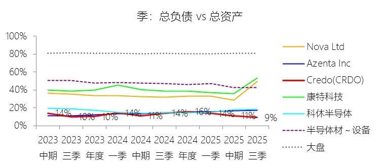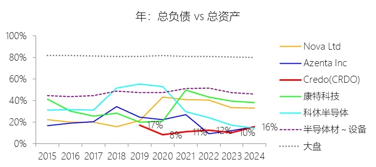 负债率:2026财年第三季末,CredoTechnologyGroupHoldingLtd的总负债为1.88亿美元,对比年初增长47.6%,与总资产的比例为9.25%(负债率),同比下降4.88个百分点;2016-2025财年(十年),此项合计为3.12亿美元,平均比例为12.76%,比半导体材料与设备行业的均值低35.19个百分点,长期呈下降趋势。比例短期下降主要由于总资产增速远超总负债增速的稀释效应,特别是2026财年前三季公司通过完成大规模的ATM(市价发行)股权融资获得了约7.36亿美元的净现金流入,带动总资产实现151.75%的跨越式增长,而同期总负债虽随业务规模扩张导致应付账款、应付薪酬及采购预提有所增加,但其47.6%的增速远低于资产端的扩张速度,导致负债率被显著摊薄;比例长期下降主要由于公司在高速成长期高度依赖股权资本市场融资而非债权融资来驱动发展,从IPO前的多轮优先股注资到IPO成功募集、再到后续的二次公开发行及ATM融资,公司构建了以股本溢价为主的强大资产基座,且随着AEC等产品爆发式上量,公司已于2025财年实现扭亏为盈,留存收益从累计亏损转为大规模积累(2026财年三季末达2.20亿美元),使得所有者权益在资本结构中的主导地位不断加强,而总负债始终维持在以经营性负债为主的较低水平;比例低于半导体材料与设备行业的均值主要由于公司采取轻资产的Fabless(无晶圆厂)经营模式,且长期保持零有息负债的财务策略,其账面上完全不存在银行借款、抵押贷款或公司债券,负债构成几乎仅限于应付账款、预收账款及办公租赁负债等日常营运开支项,相比该行业组中如阿斯麦(ASML)、应用材料(AMAT)等已进入成熟期、习惯利用财务杠杆进行资本运作或拥有重资产制造环节的巨头企业,Credo的资本结构具有极高的流动性和极低的财务杠杆风险,表现出成长型高科技企业特有的低负债、高现金特征。