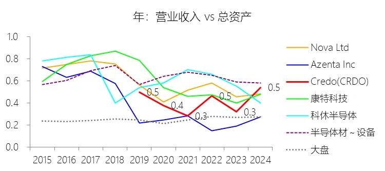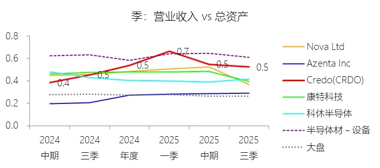 总资产周转率:2026财年Q3 TTM,CredoTechnologyGroupHoldingLtd的总资产周转率为0.5次,同比上升0.07次;2016-2025财年(十年),平均总资产周转率为0.4次,比半导体材料与设备行业的均值低0.21次,长期呈上升趋势。