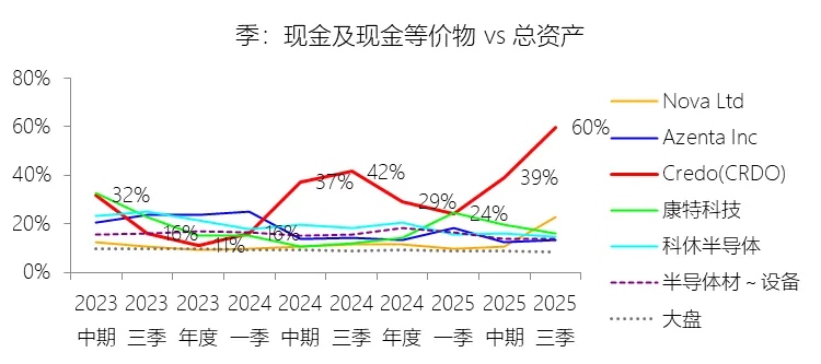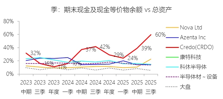 期末现金及现金等价物余额:2026财年第三季末,CredoTechnologyGroupHoldingLtd的期末现金及现金等价物余额为12.20亿美元,对比年初增长416.43%,与总资产的比例为59.90%,同比上升18.34个百分点;2016-2025财年(十年),此项合计为8.49亿美元,平均比例为34.68%,比半导体材料与设备行业的均值高16.09个百分点,长期呈下降趋势。